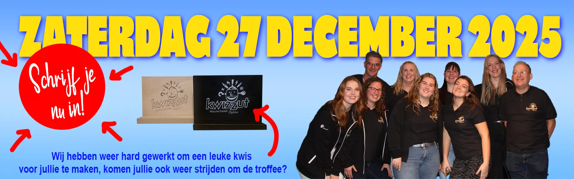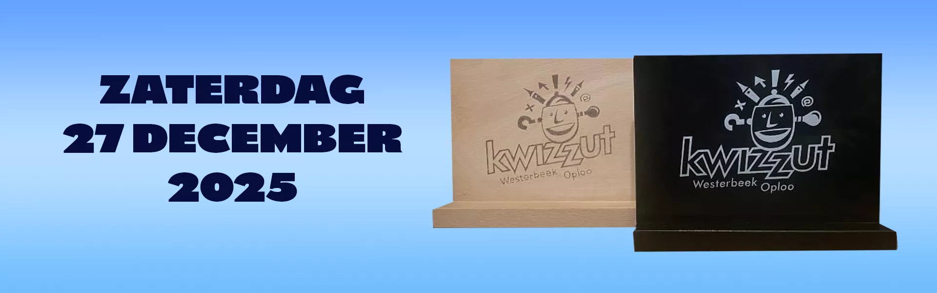 Kwizzut 2025 wordt gehouden op "Derde Kerstdag" vrijdag 27 december 2025. De donkere dagen rond Kerst en Nieuwjaar zijn dé dagen van het jaar waarop je spelletjes speelt en met familie en vrienden gezellig samenkomt. Een leuk avondje quizzen met familie, vrienden, buurtvereniging, sportclub, collega’s of zomaar een groep mensen past hier prima bij. Een team mag uit een onbeperkt aantal personen bestaan, aangeraden wordt om minimaal met 10-15 personen te zijn voor de kleine kwis en 20+ voor de grote kwis. Voorwaarde is dat minimaal twee teamleden woonachtig zijn in Westerbeek en/of Oploo.